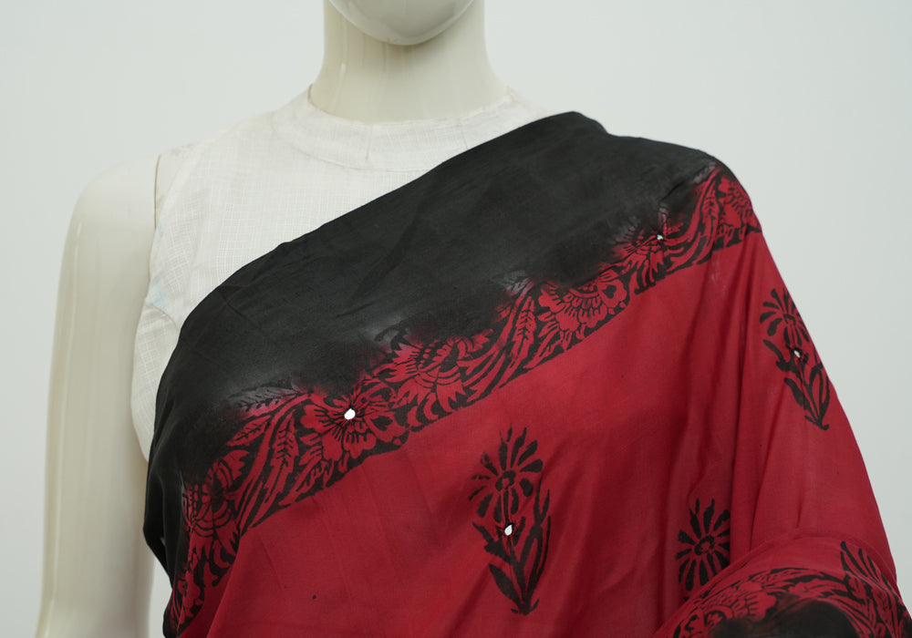 Red and Black Block Printed Chennur Silk Saree with Mirror Work is OUT OF STOCK currently and available on pre-payment only. Order now for delivery within 2 weeks.