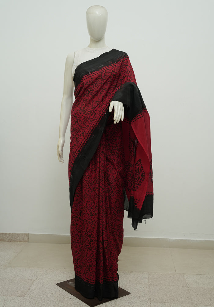 Red and Black Block Printed Chennur Silk Saree with Mirror Work