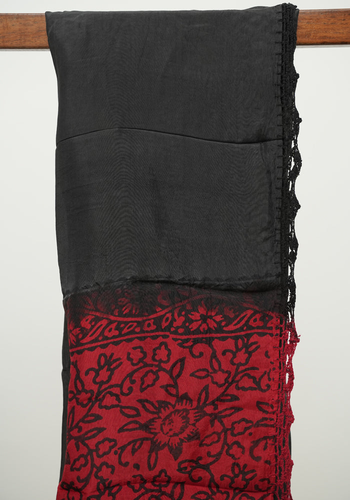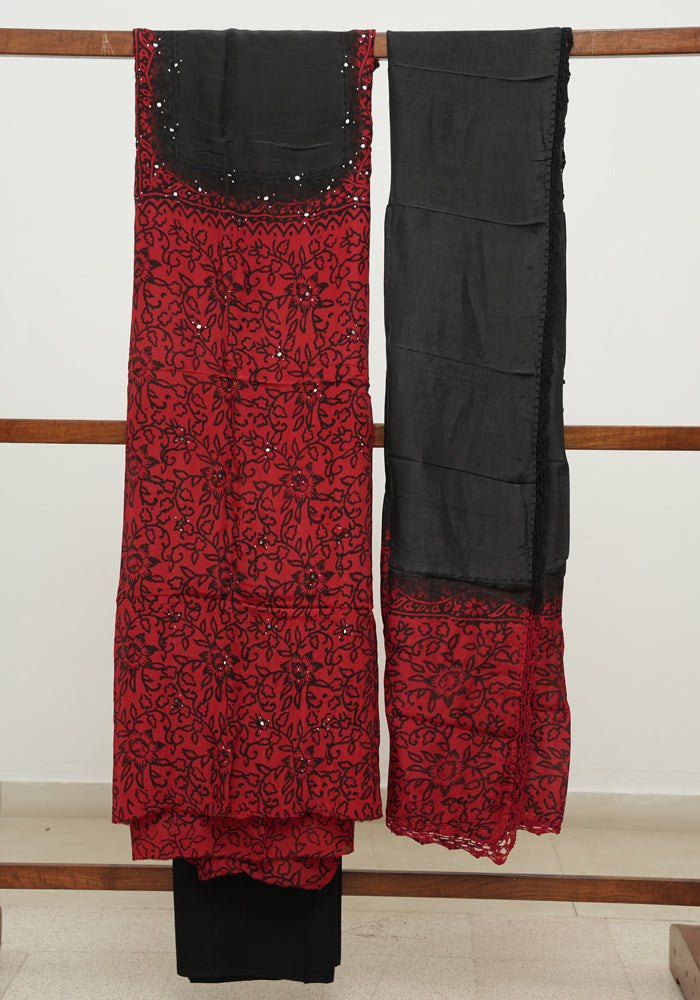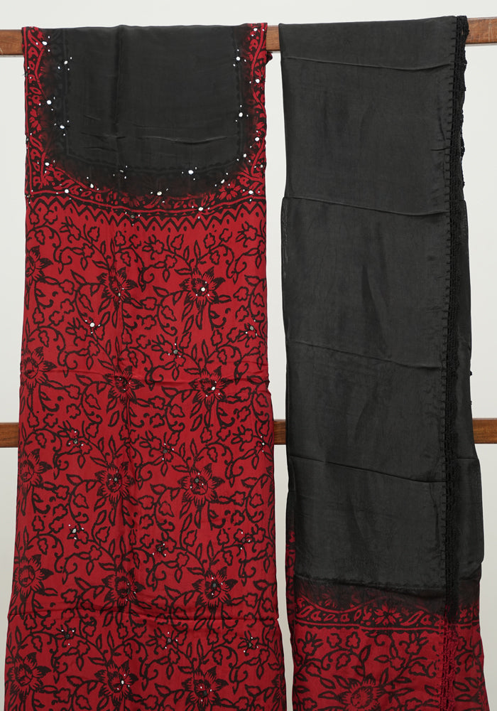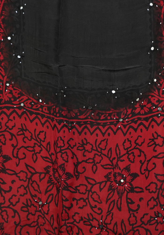 Red and Black Unstitched Blockprinted Semi Organza Salwar Set With Crochet Dupatta