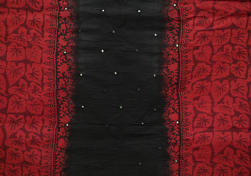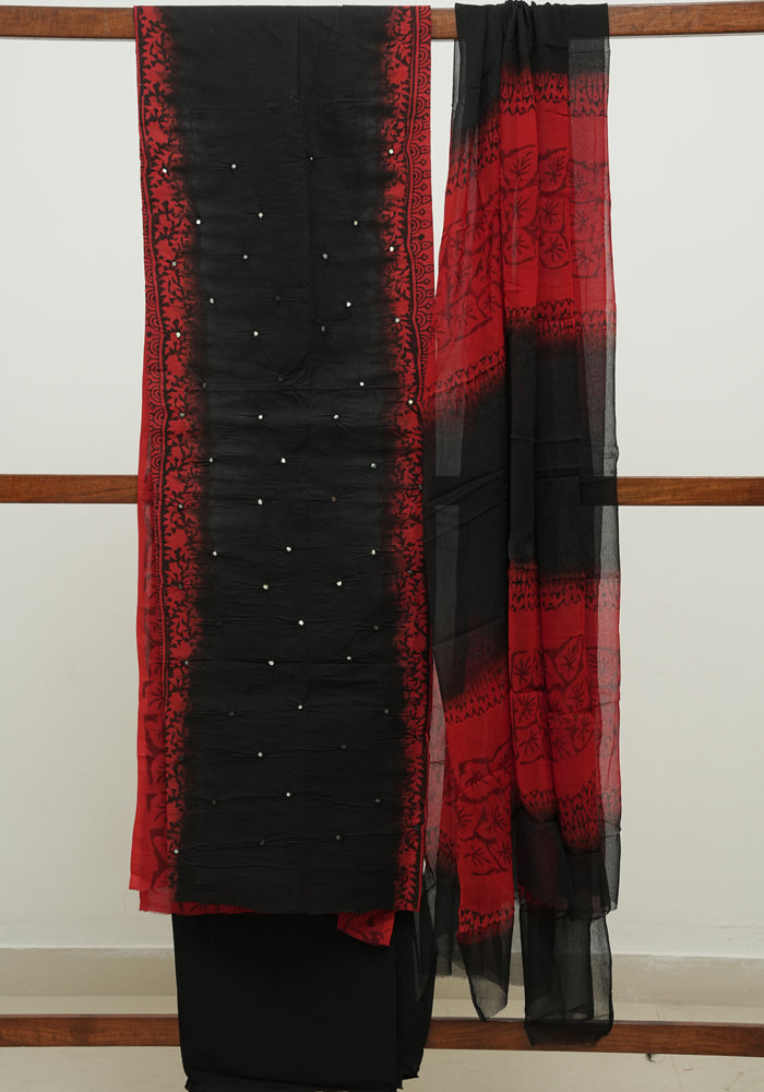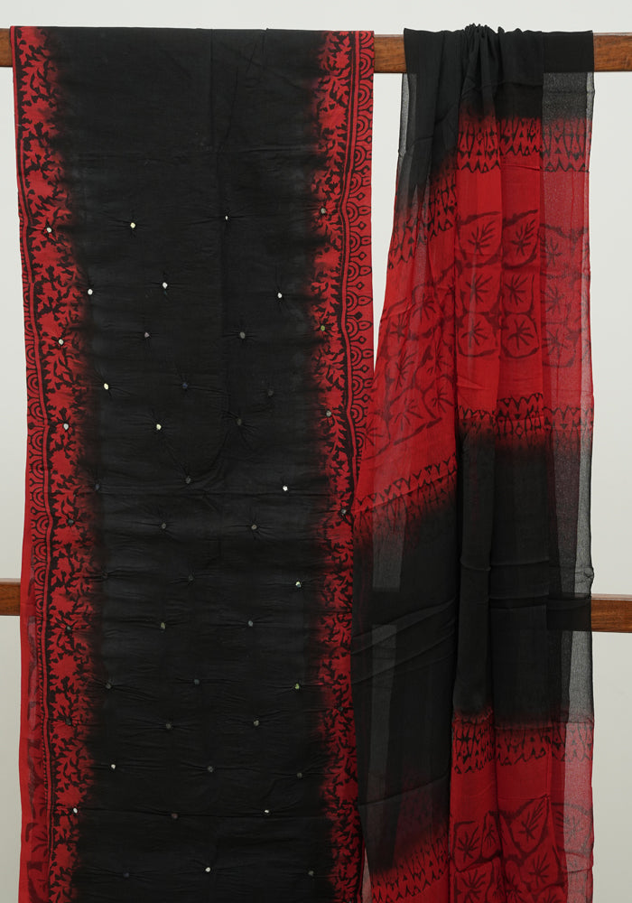 Red and Black Unstitched Cotton Salwar Set With Mirror Work