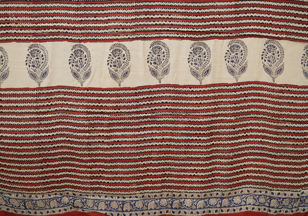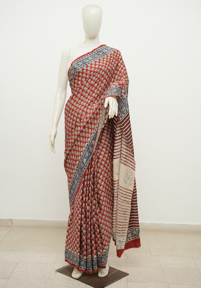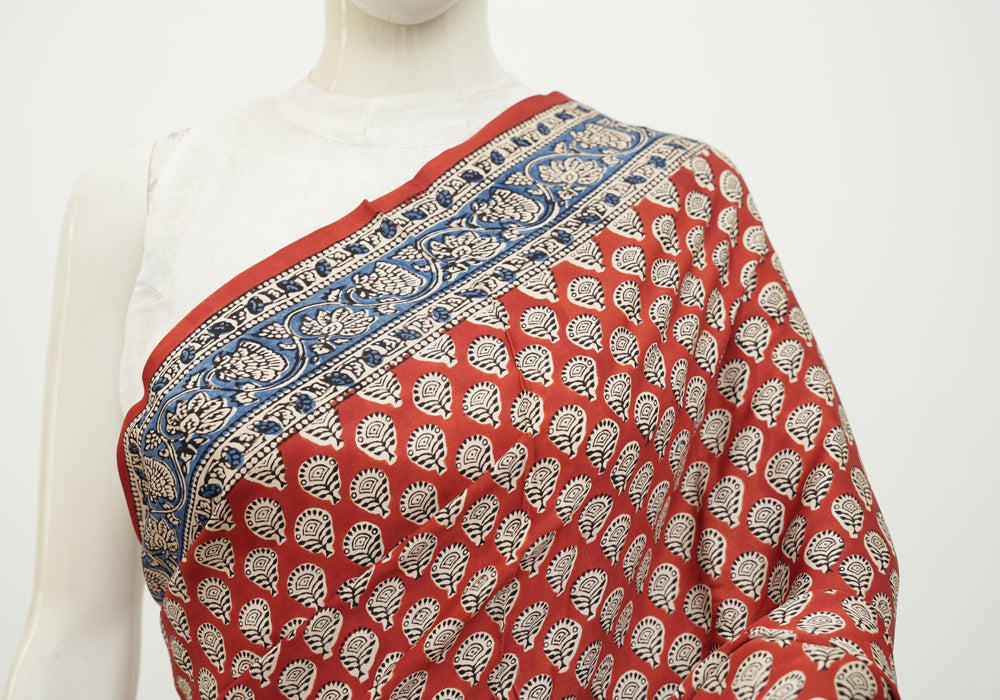 Red and Blue Block Printed Modal Silk saree