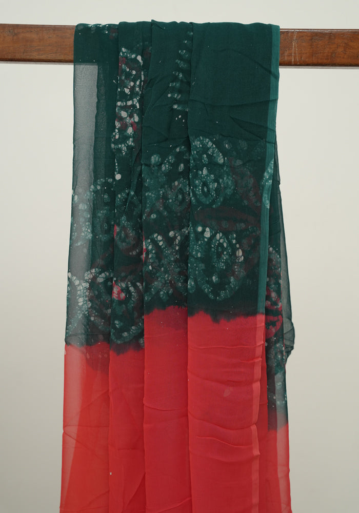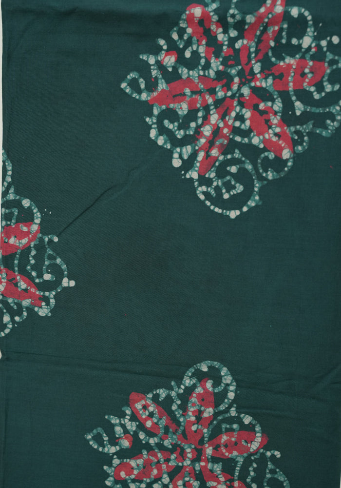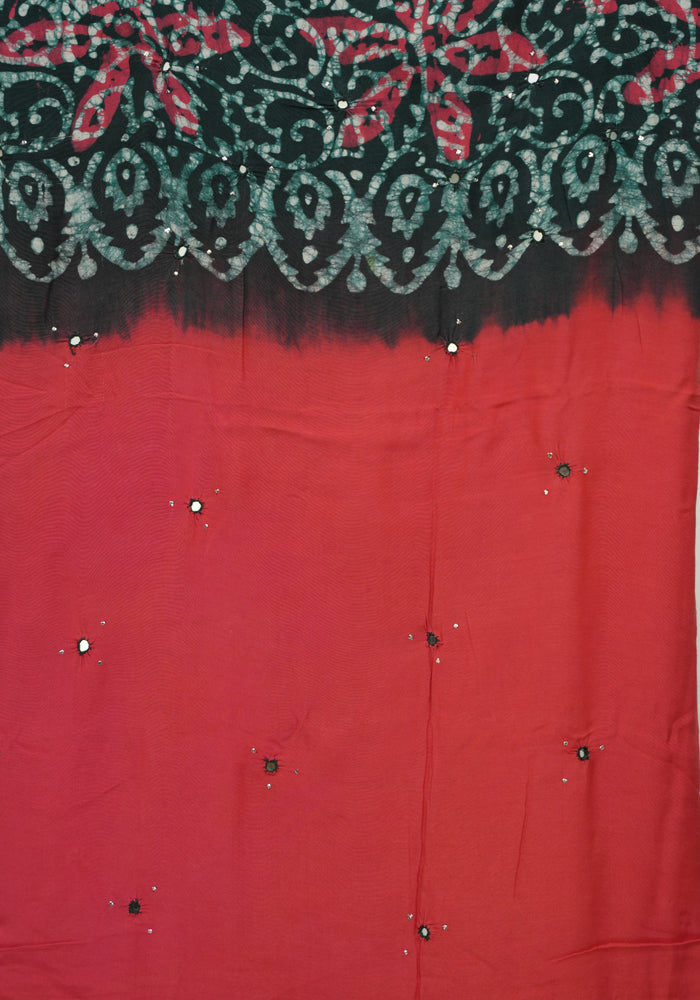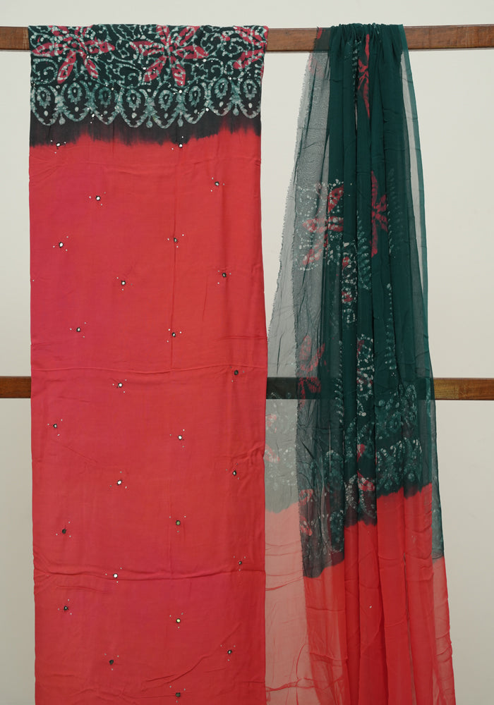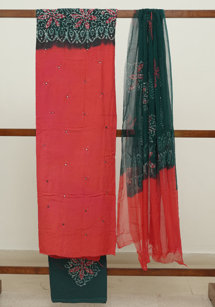 Red and Green Batik Unstitched Muslin Chennur Silk Salwar Set With Mirror and Badla Work
