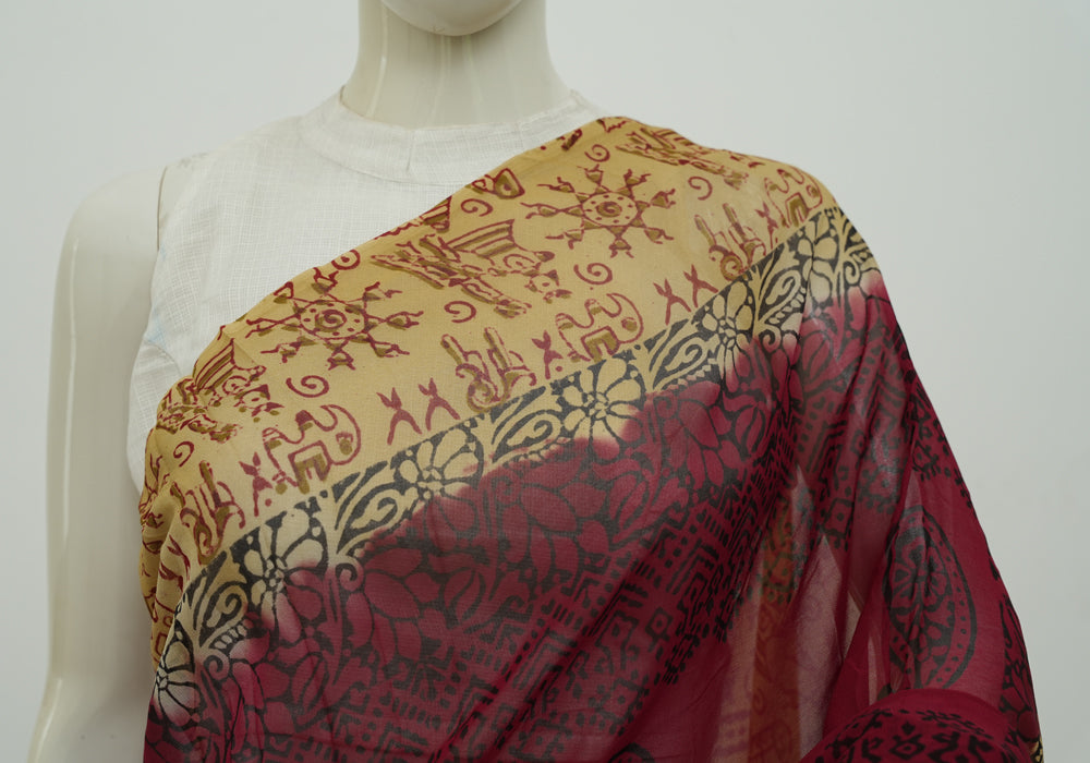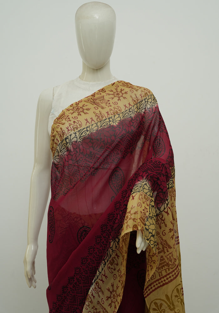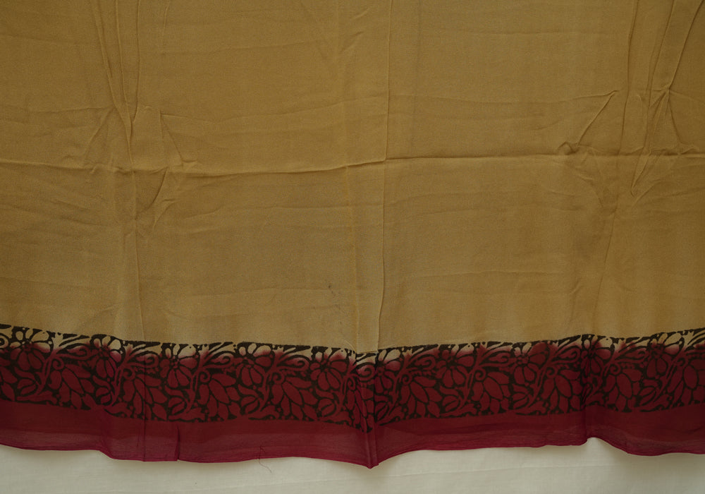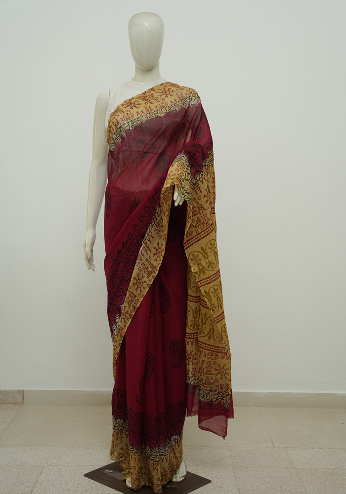 Red and Light Brown Block Printed Georgette Saree is OUT OF STOCK currently and available on pre-payment only. Order now for delivery within 2 weeks.