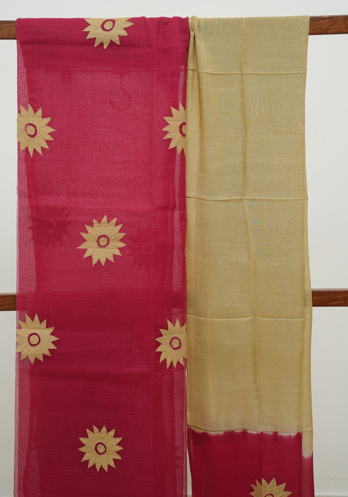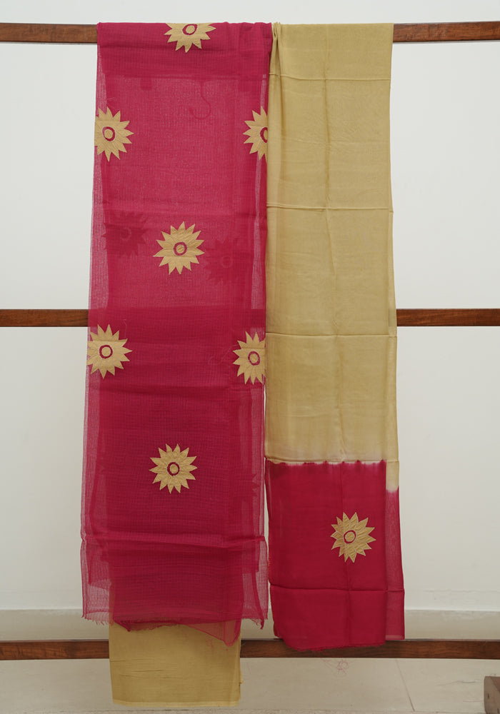 Red and Light Brown Unstitched Applique Work Kota Salwar Set With Silk Dupatta