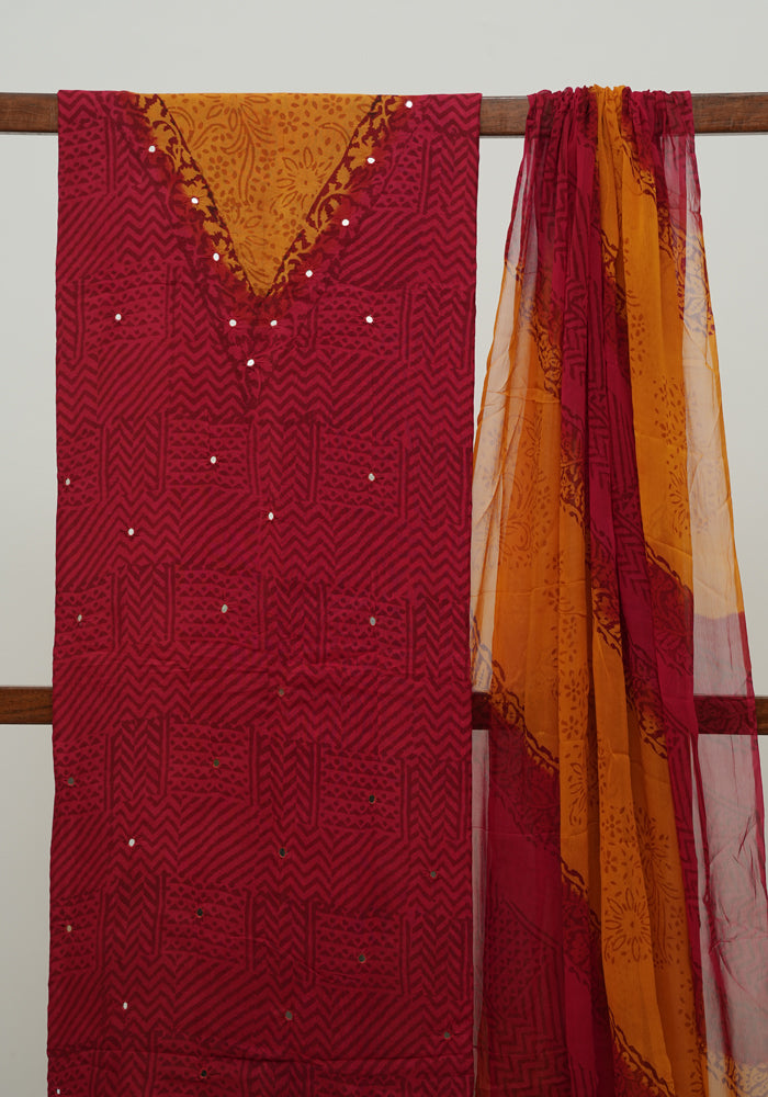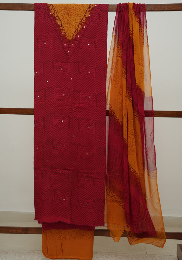Red and Mango Yellow Unstitched Chennur Silk Salwar Set With Mirror Work