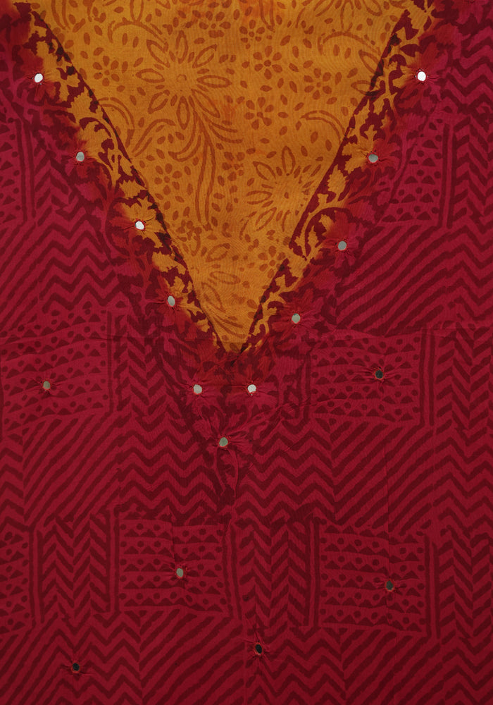 Red and Mango Yellow Unstitched Chennur Silk Salwar Set With Mirror Work is OUT OF STOCK currently and available on pre-payment only. Order now for delivery within 2 weeks.