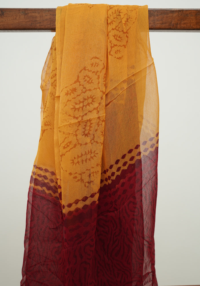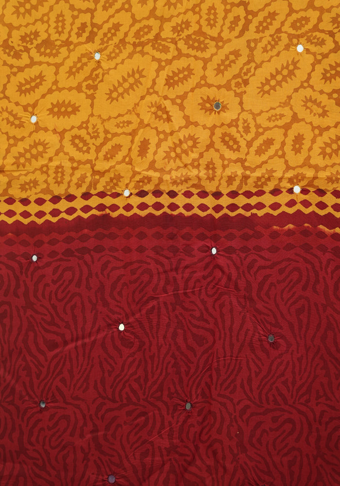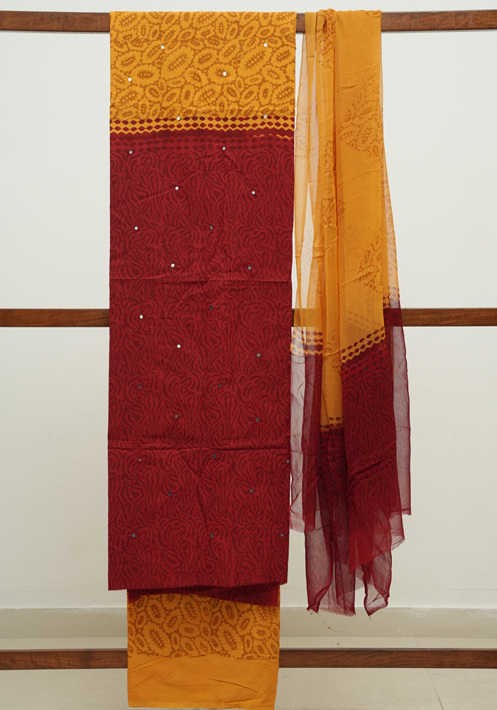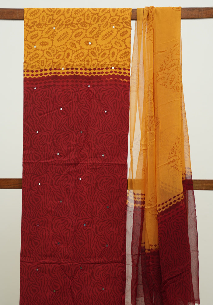 Red and Mango Yellow Unstitched Cotton Salwar Set With Mirror Work