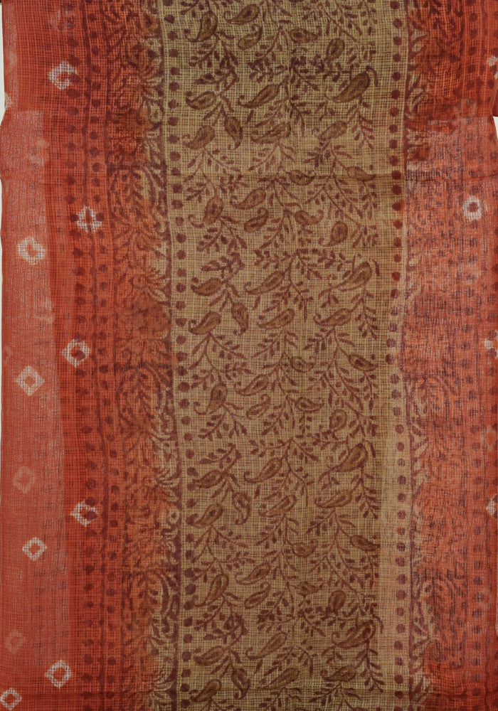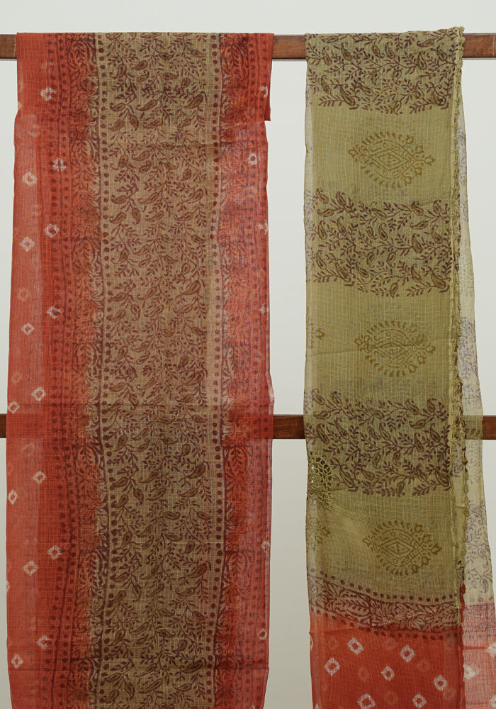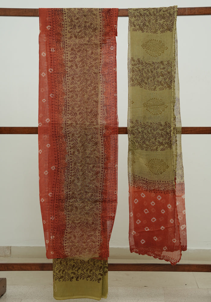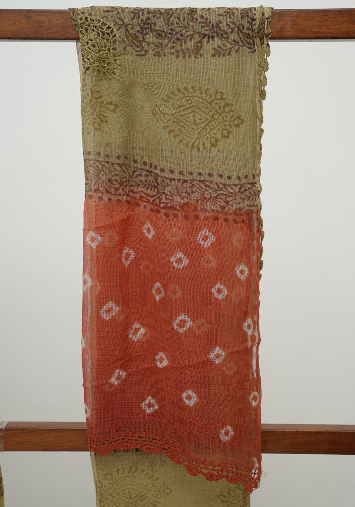 Rust Orange and Olive Green Unstitched Block Printed Kota Salwar Set With Bandini and Crochet Dupatta