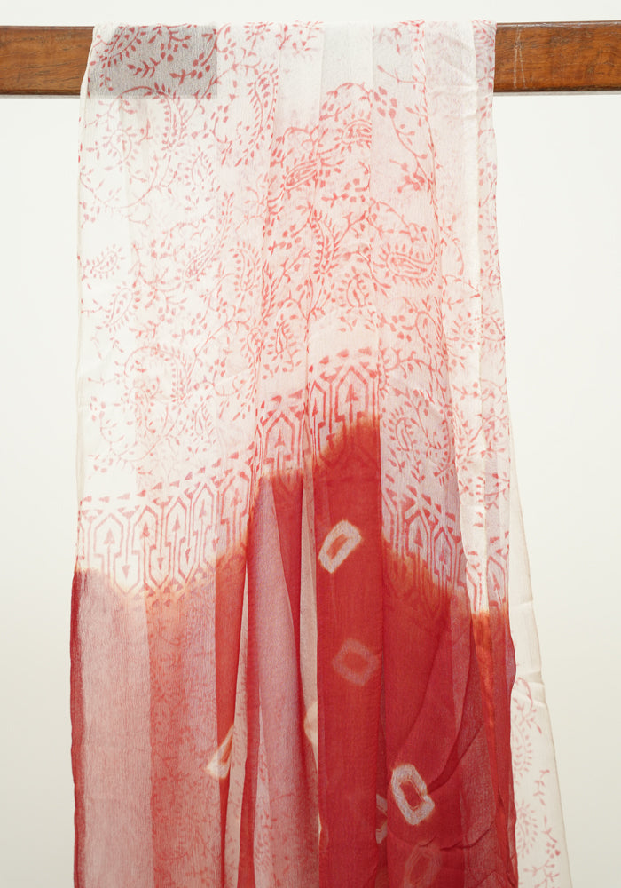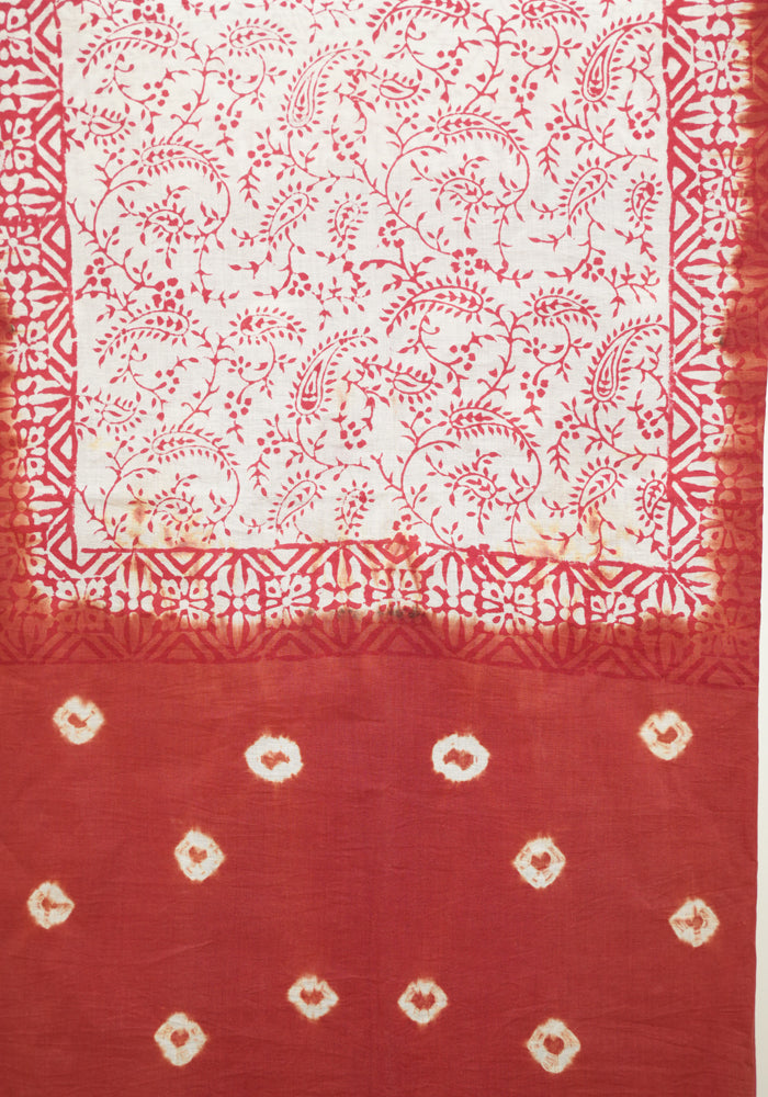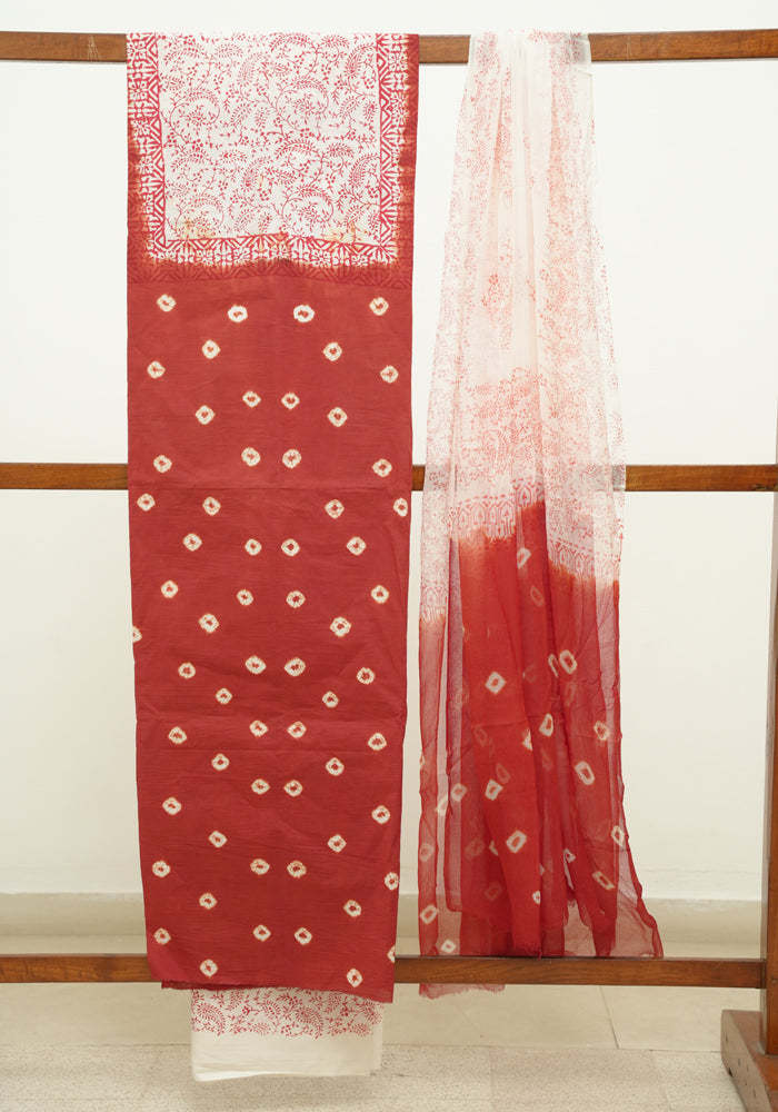 Rust Red and White Unstitched Cotton Salwar Set With Bandini