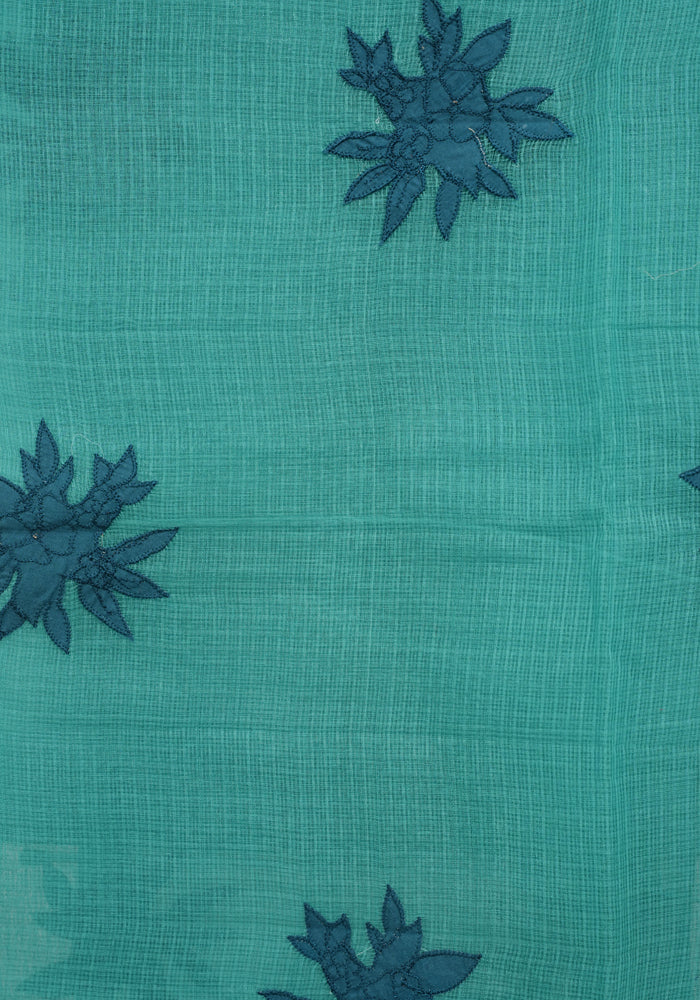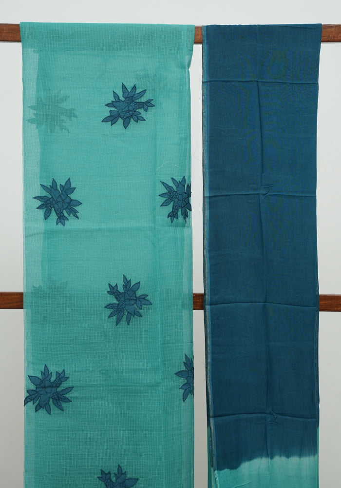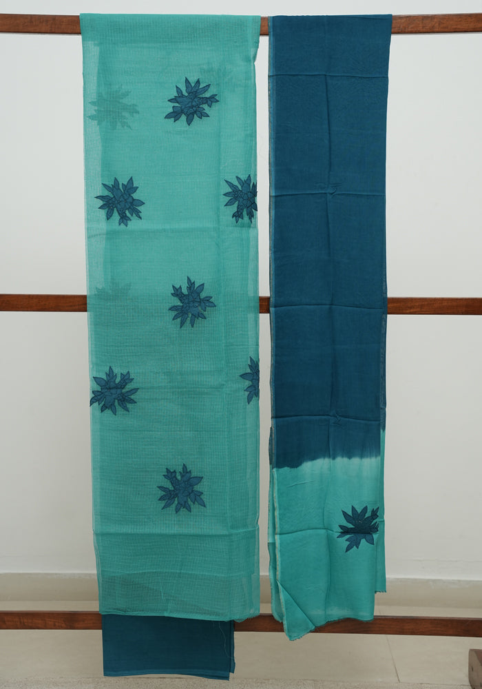 Sea Green and Teal Blue Unstitched Applique Work Kota Salwar Set With Silk Dupatta