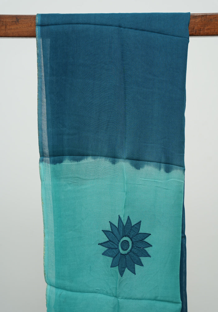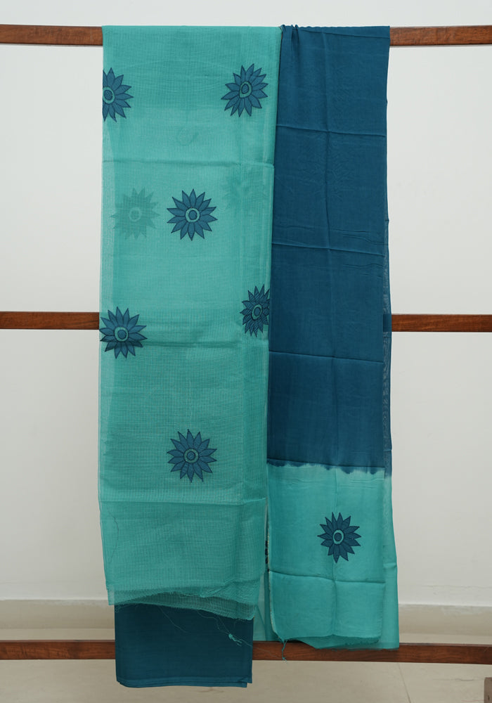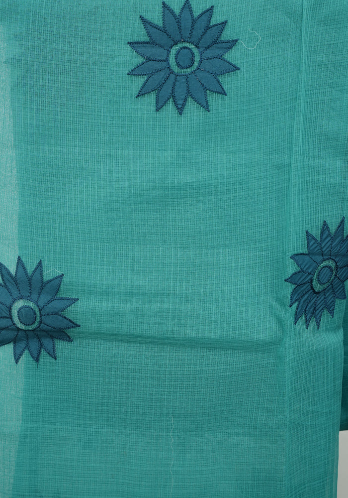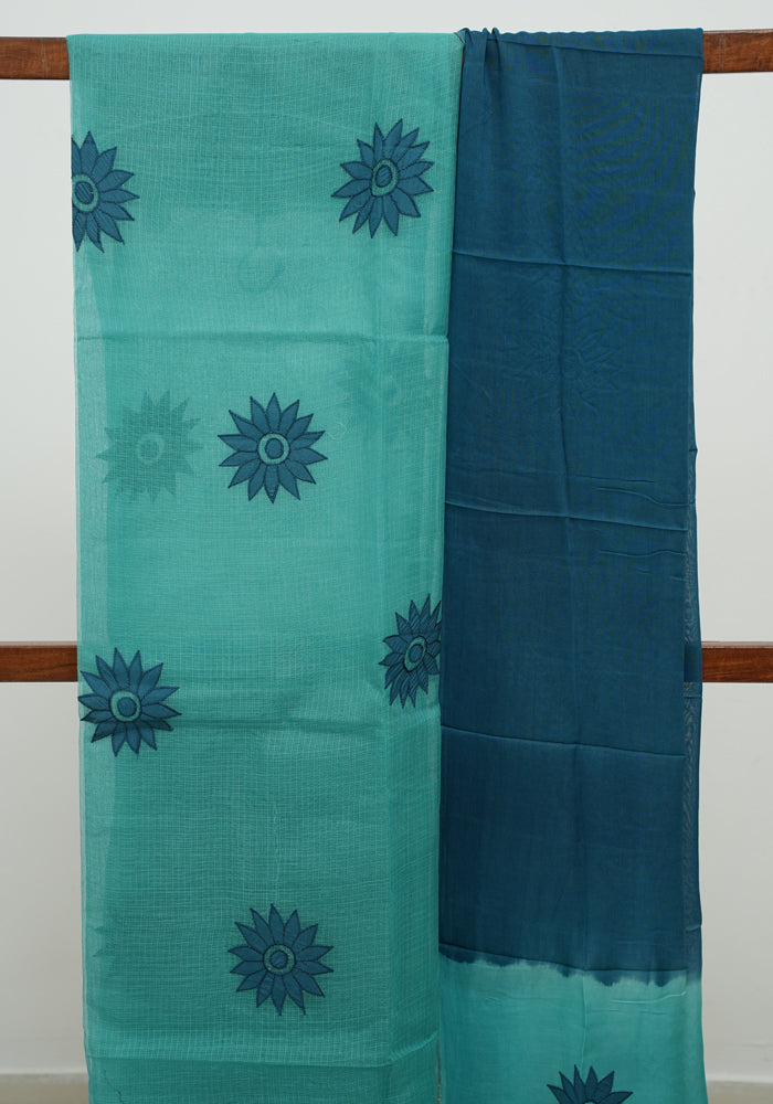 Sea Green and Teal Blue Unstitched Applique Work Kota Salwar Set With Silk Dupatta