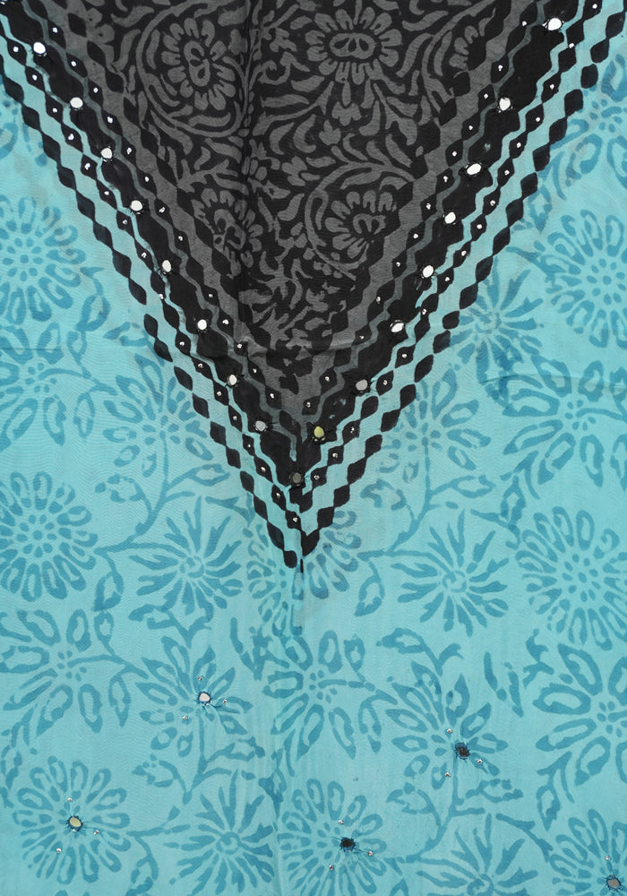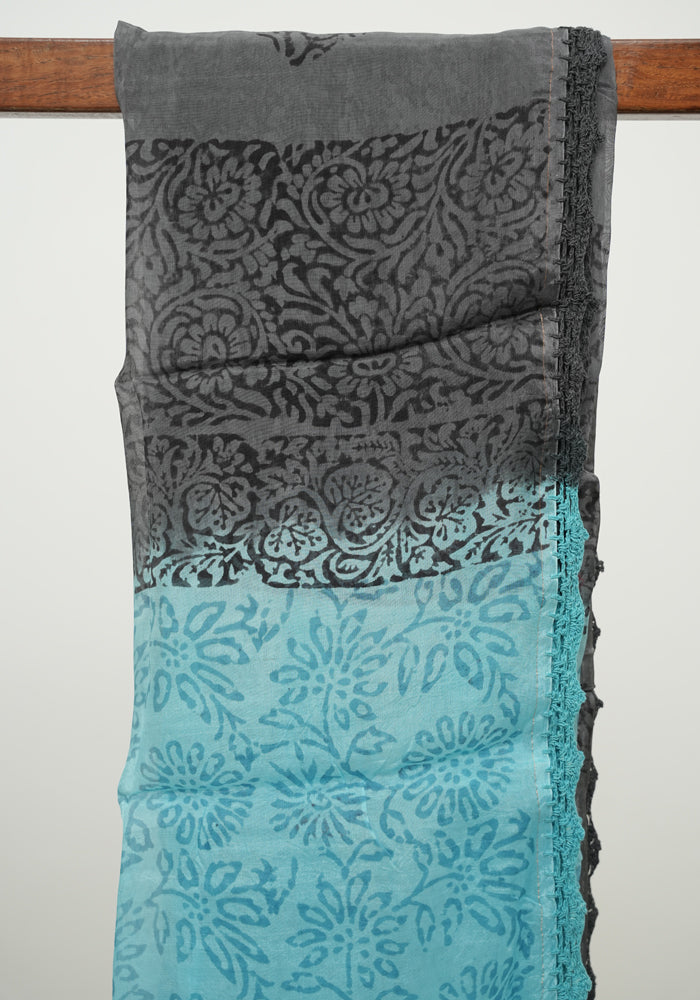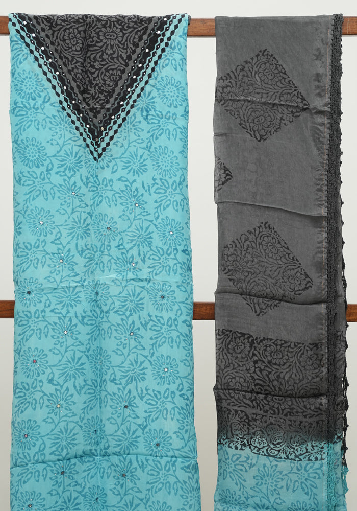 Sky Blue and Grey Unstitched Blockprinted Semi Organza Salwar Set With Crochet Dupatta