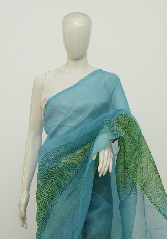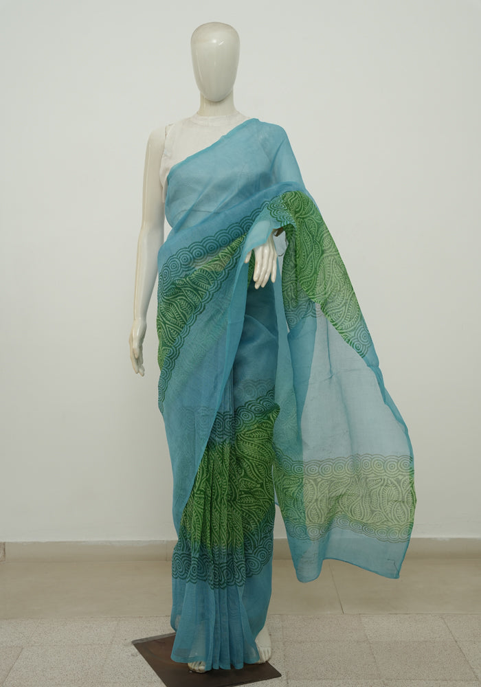 Sky Blue and Parrot Green Block printed Supernet Kota Saree