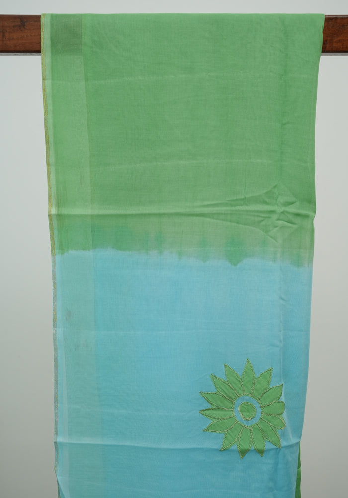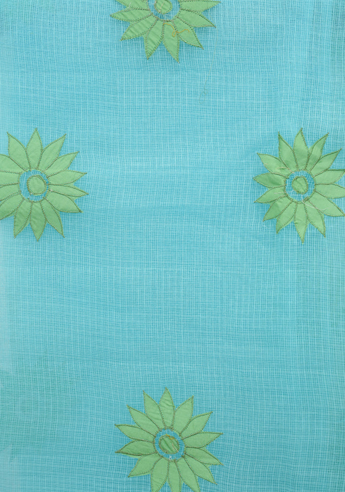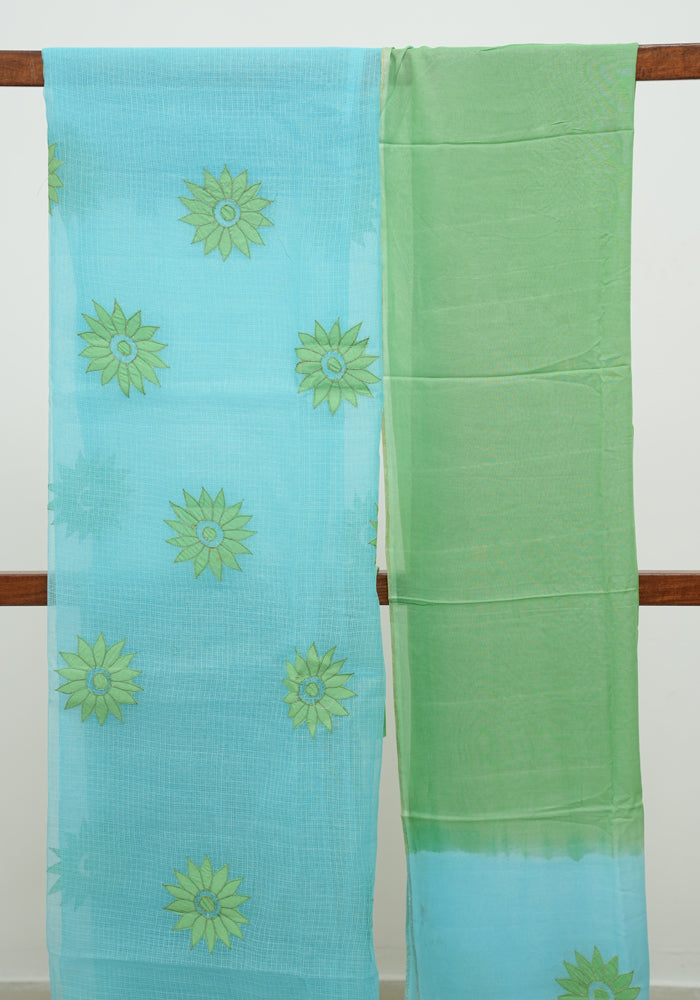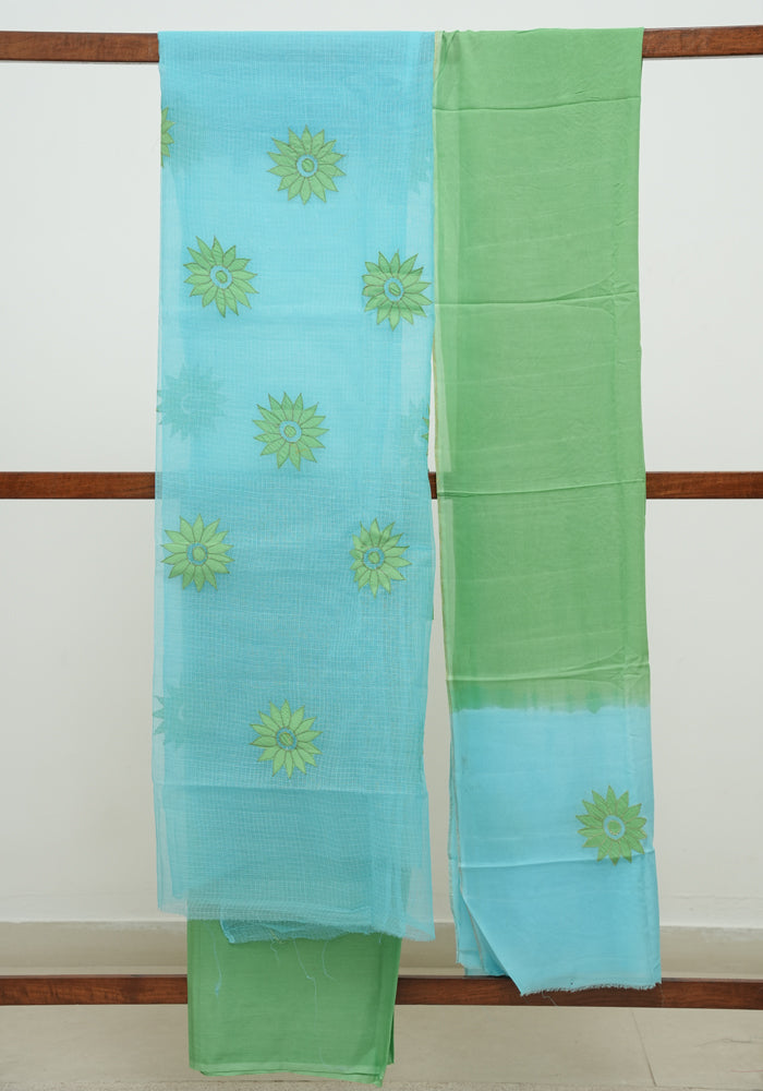 Sky Blue and Parrot Green Unstitched Applique Work Kota Salwar Set With Silk Dupatta