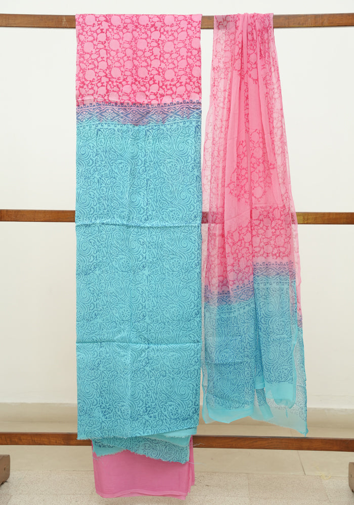 Sky Blue and Pink Modal Silk Block Printed Unstitched Salwar Set