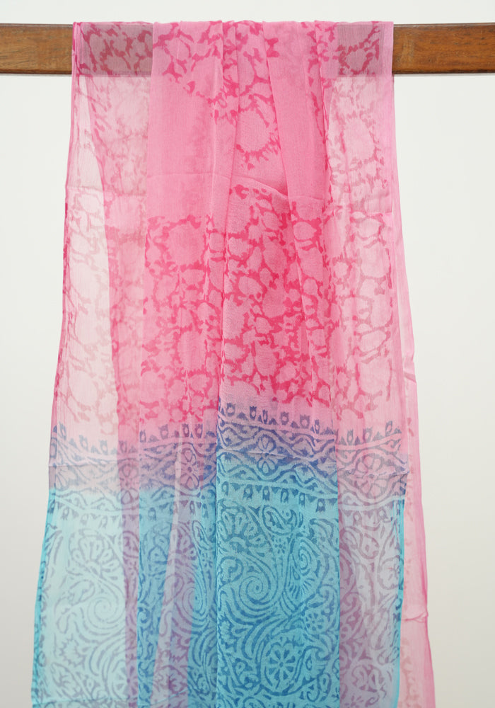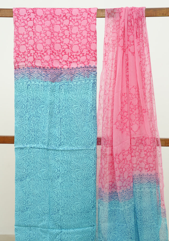 Sky Blue and Pink Modal Silk Block Printed Unstitched Salwar Set is OUT OF STOCK currently and available on pre-payment only. Order now for delivery within 2 weeks.