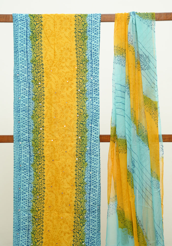 Sky Blue and Yellow Unstitched Chennur Silk Salwar Set With Mirror Work is OUT OF STOCK currently and available on pre-payment only. Order now for delivery within 2 weeks.