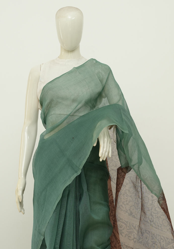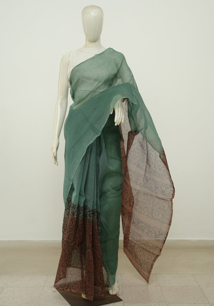 Teal Green and Brown Block printed Supernet Kota Saree