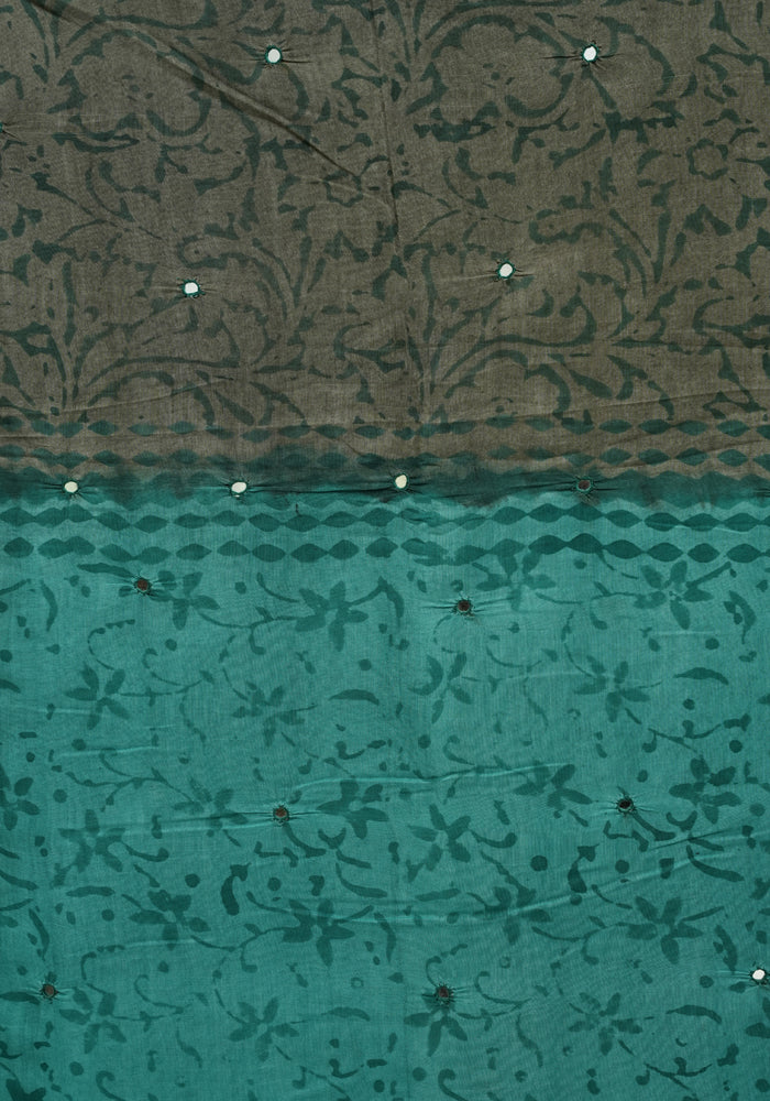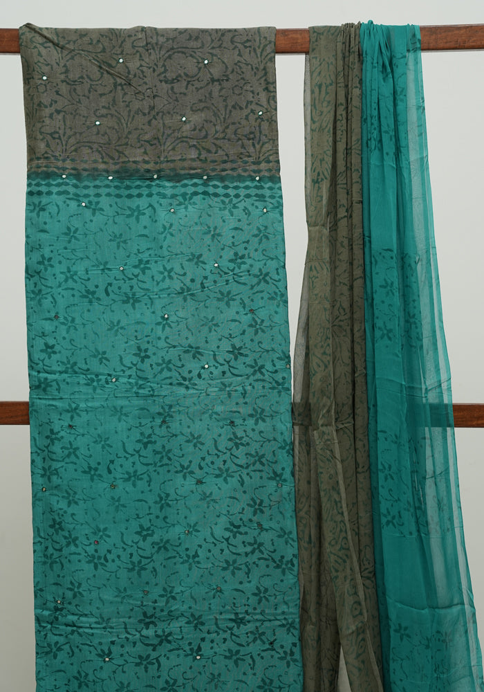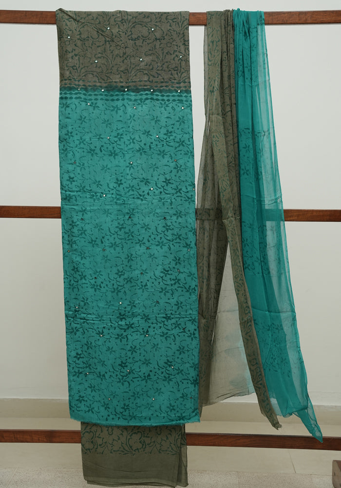 Turquoise Green and Grey Unstitched Chennur Silk Salwar Set With Mirror Work