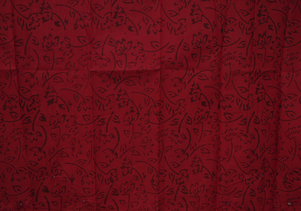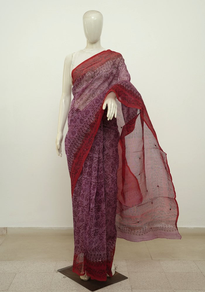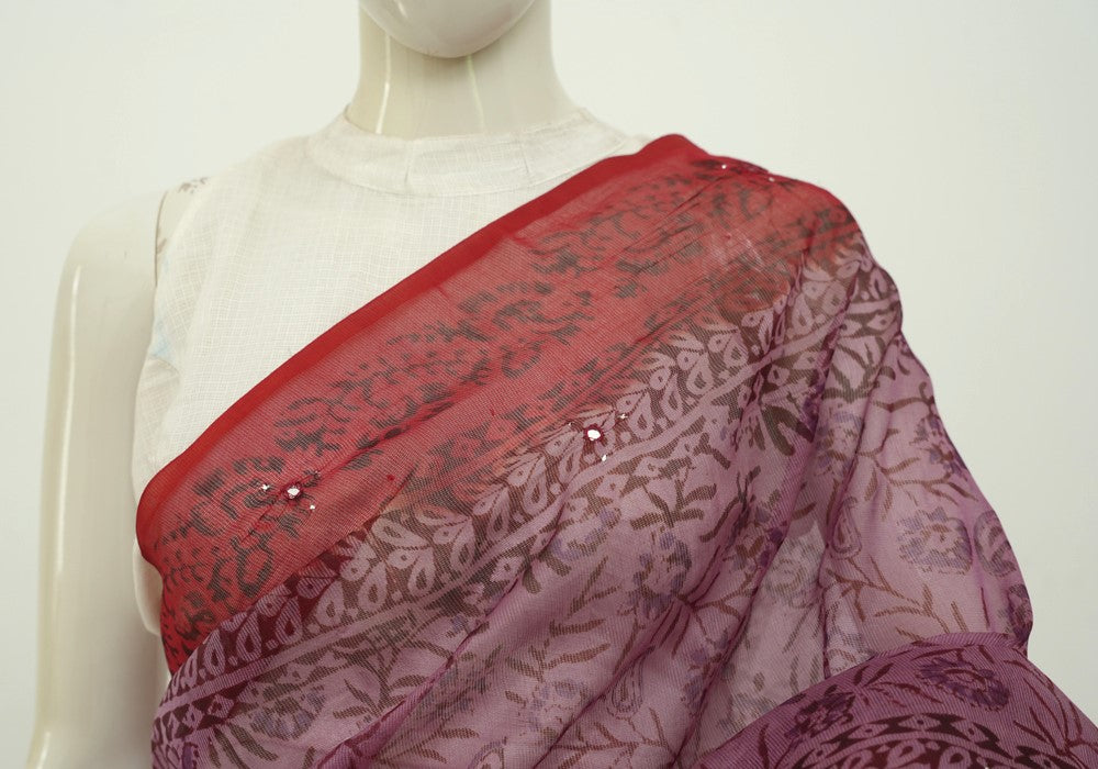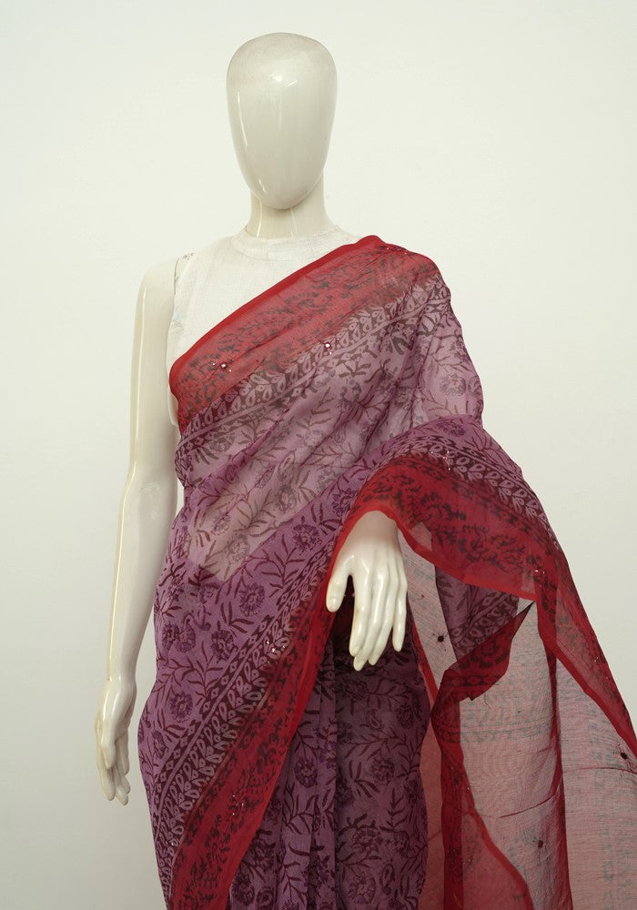 Purple and Red Block Printed Supernet Kota saree With Mirror and Badla Work
