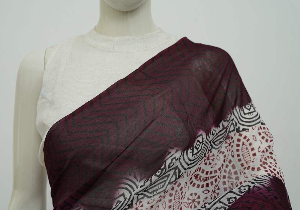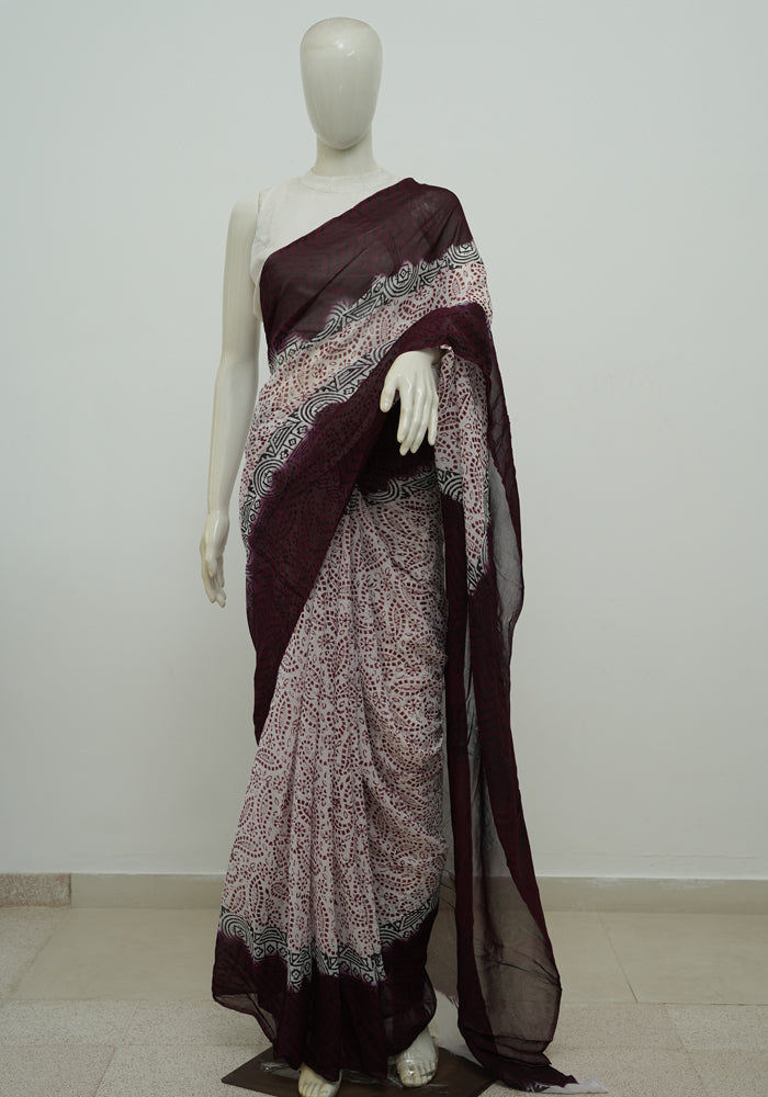White and Jamun Red Block Printed Georgette Saree is OUT OF STOCK currently and available on pre-payment only. Order now for delivery within 2 weeks.