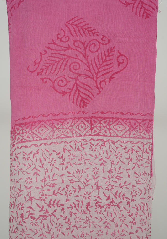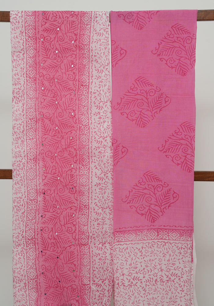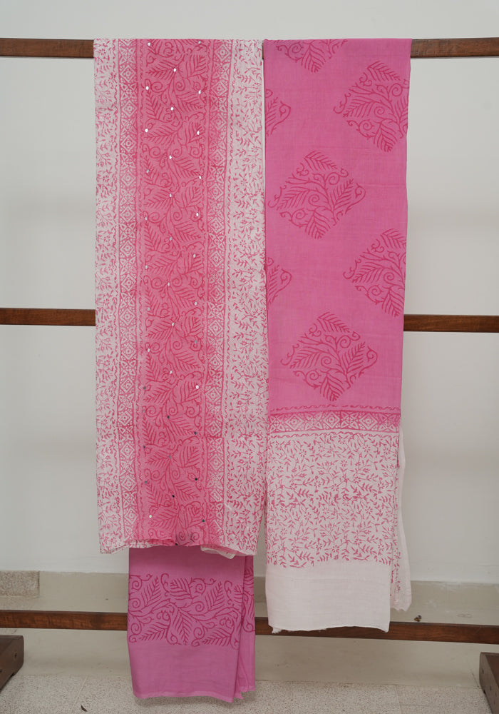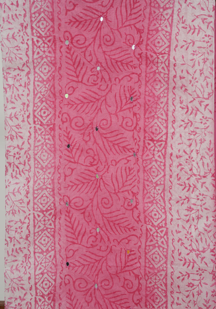 White and Pink Unstitched Organdy Cotton Salwar Set With Mirror Work