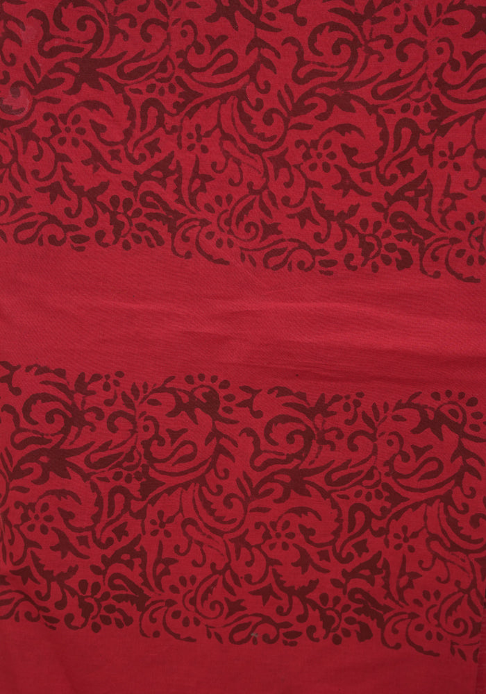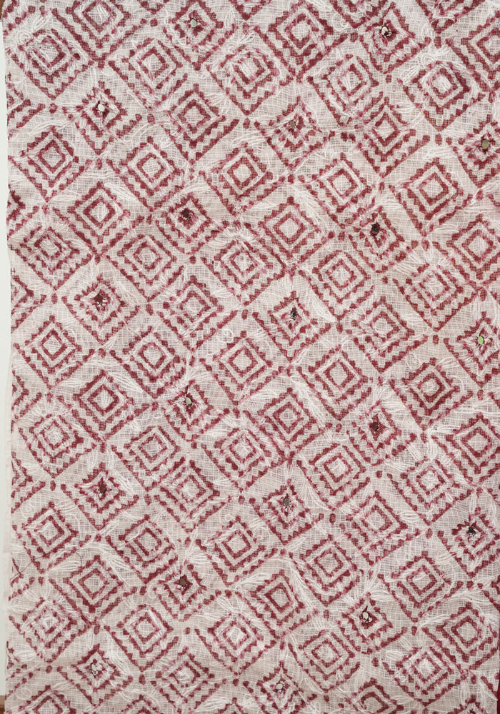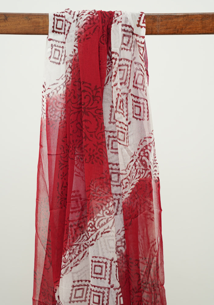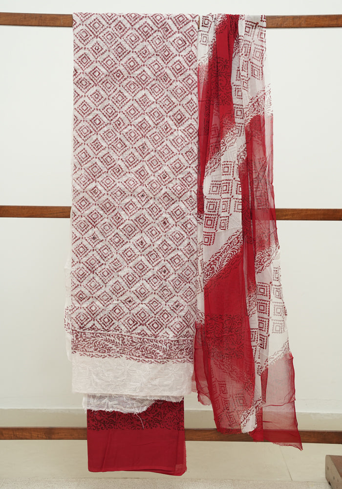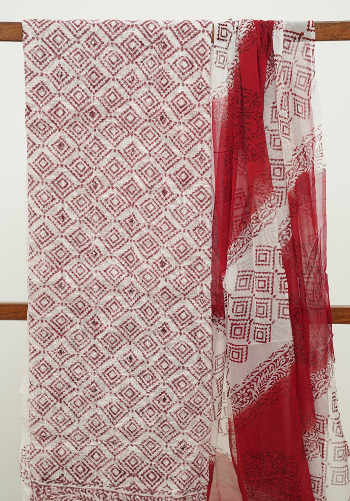 White and Red Block Printed Tepchi Kota Unstitched Salwar Set With Mirror Work