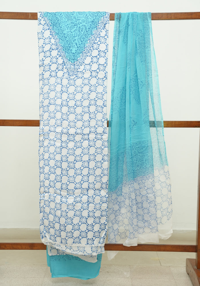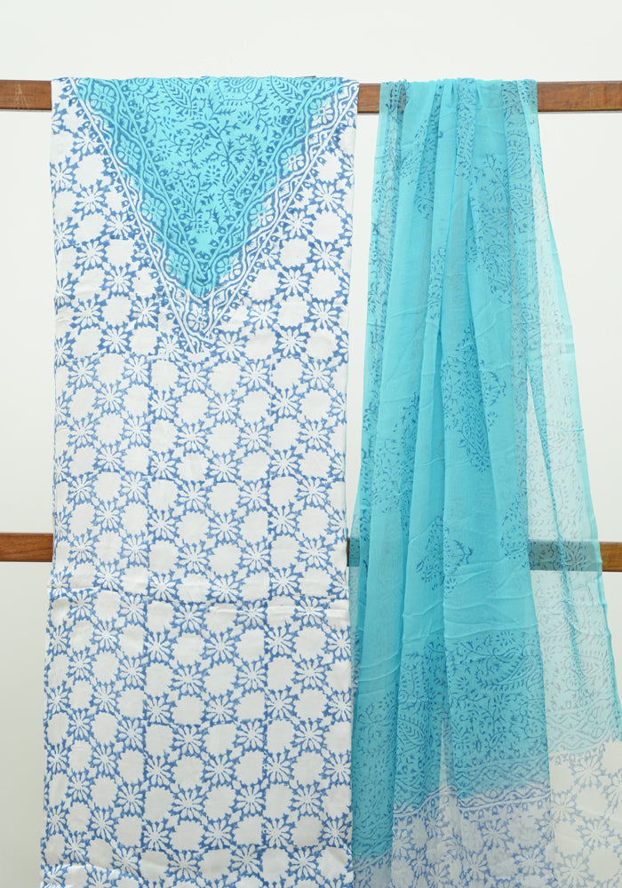 White and Sky Blue Modal Silk Block Printed Unstitched Salwar Set