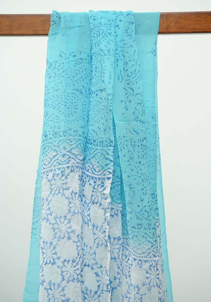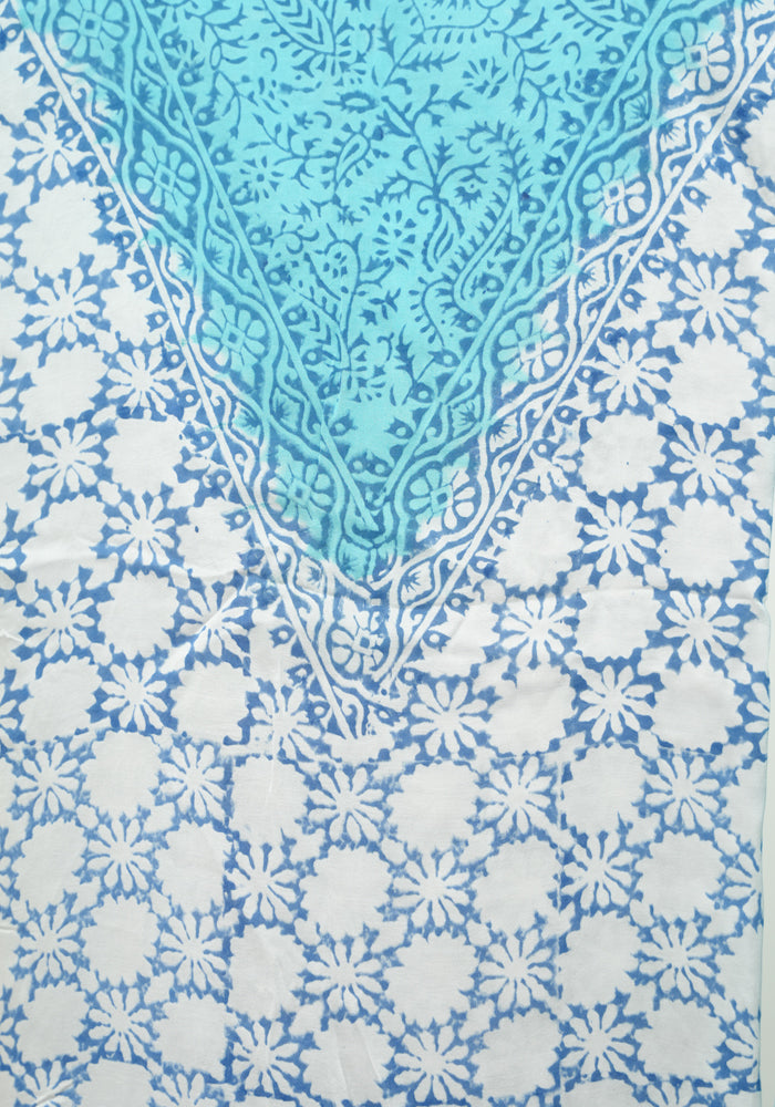 White and Sky Blue Modal Silk Block Printed Unstitched Salwar Set is OUT OF STOCK currently and available on pre-payment only. Order now for delivery within 2 weeks.