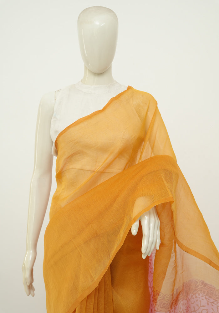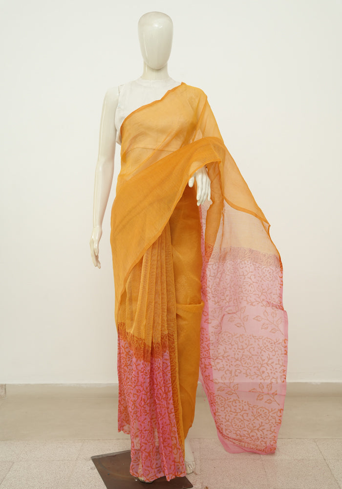 Yellow and Pink Block printed Supernet Kota Saree is OUT OF STOCK currently and available on pre-payment only. Order now for delivery within 2 weeks.