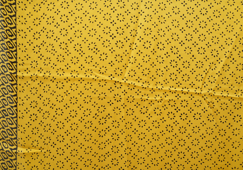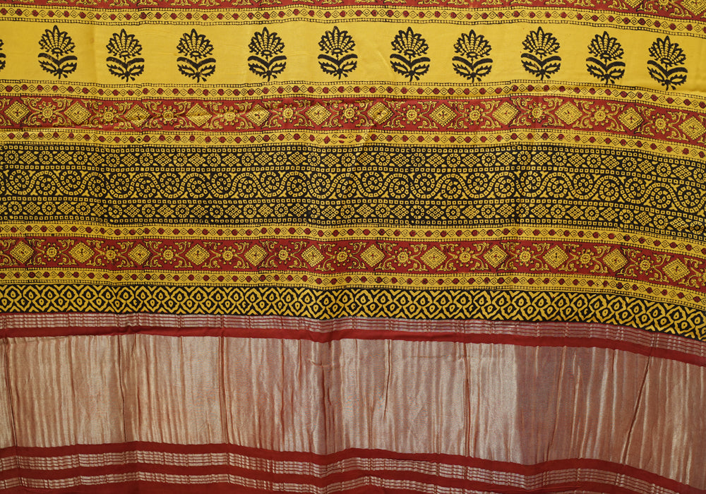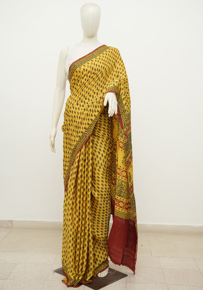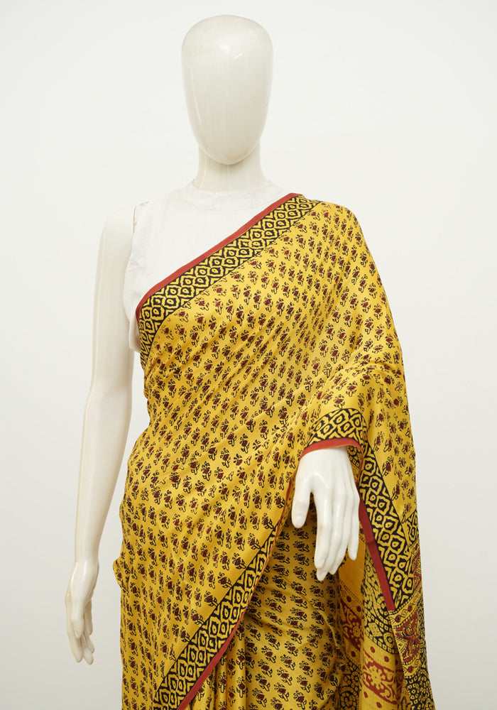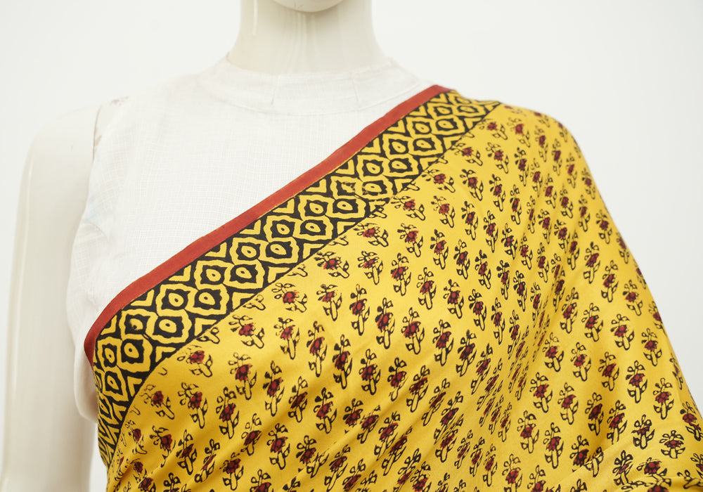 Yellow and Red Block Printed Modal Silk saree