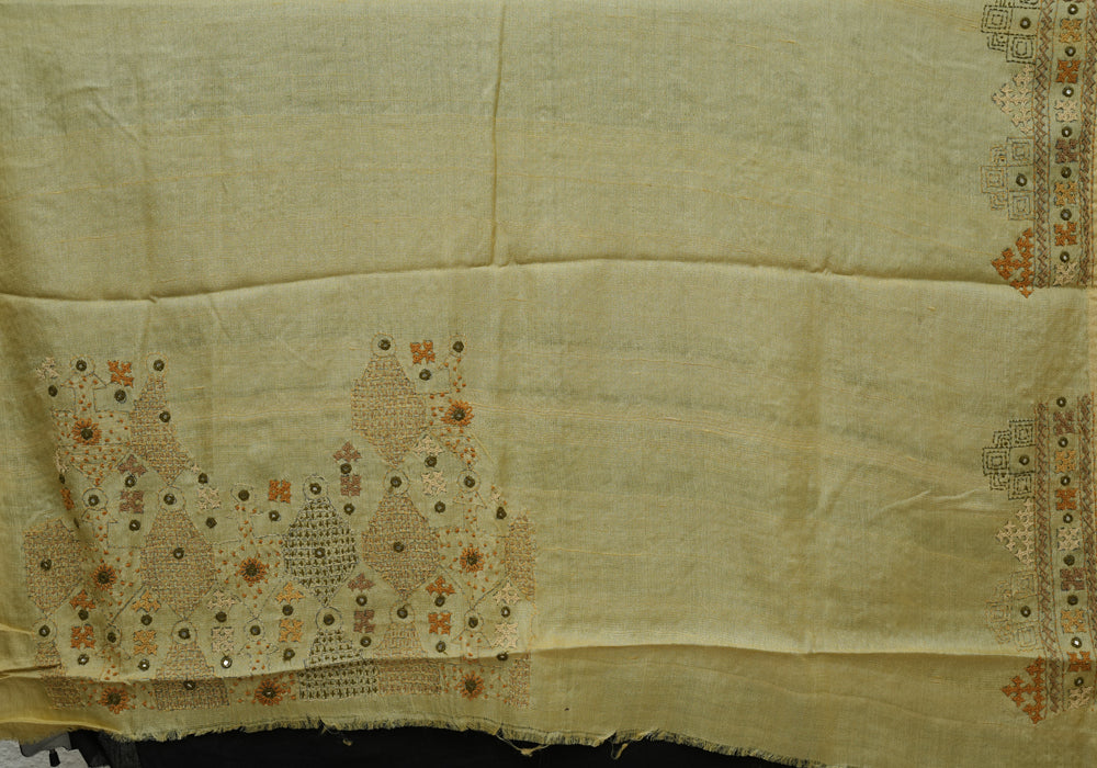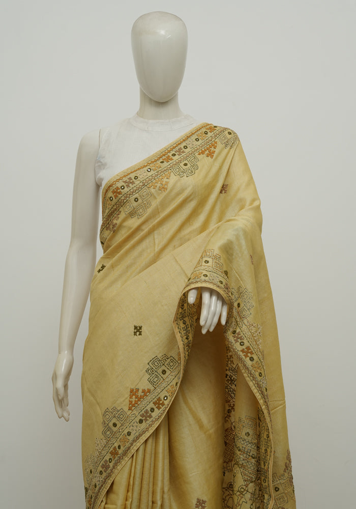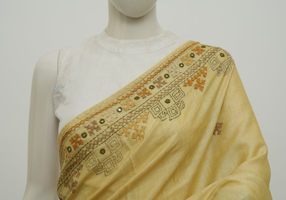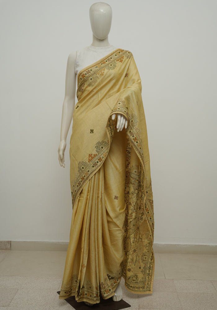 Yellow Tussar Silk Saree With Kutch and Mirror Work is OUT OF STOCK currently and available on pre-payment only. Order now for delivery within 2 weeks.